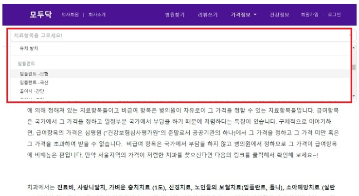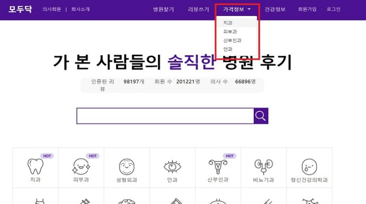 - 모두닥 사이트 접속 후 가격정보> 치과 선택