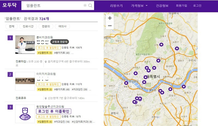 그리고 모두닥 사이트의 또 다른 좋은 기능으로는 지역별 임플란트를 시술하는 병원을 조회하고 리뷰를 확인할 수 있다는 점입니다. 사시는 지역에 맞춰 검색하시면 병원에 직접 발품 팔지 않으셔도 생생한 리뷰와 평점 확인을 통해 병원을 직접 방문하여 정보를 얻은 것 같은 효과를 누리실 수 있으십니다.
