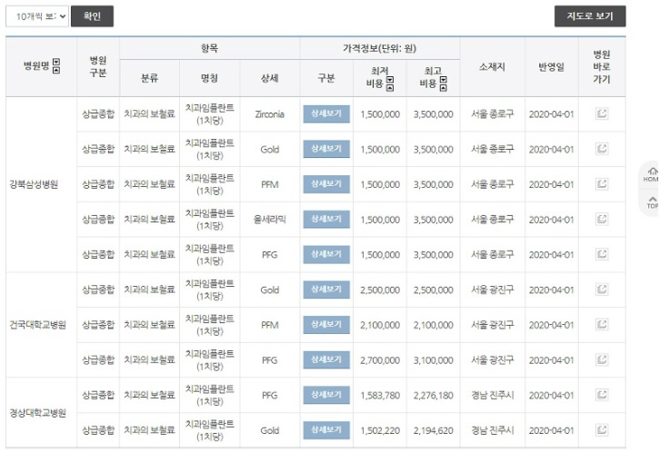엔터키를 입력한 후 마우스 스크롤을 아래로 내려주면 병원 규모에 따라 가장 높은 임플란트 가격과 가장 낮은 임플란트 가격을 확인하실 수 있습니다. 임플란트 종류를 선택하여 검색하시면 좀 더 세부적이고 명확한 정보를 얻으실 수 있습니다.