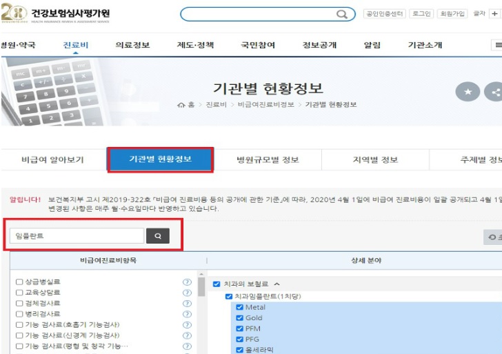 다음으로 알아볼 임플란트 가격비교 사이트 는 건강보험심사평가원입니다. 이 사이트에서는 2020년 4월 1일부터 비급여 진료비용 등의 공개에 관한 기준이라는 규정에 따라 진료 비용 및 정보를 현행화 하여 지속적으로 공개하고 있습니다. 진료과 목마다 진료비를 확인할 수 있기 때문에 임플란트 가격에 대해서도 알 수 있습니다.